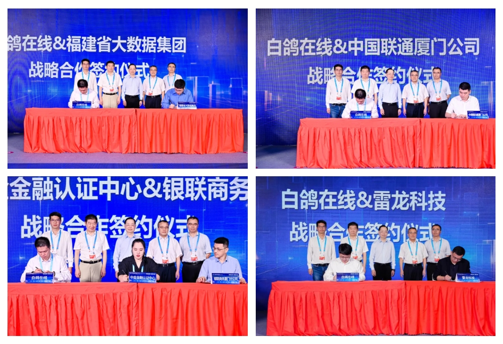 现场签约仪式上,白鸽在线与福建省大数据集团、中国联通厦门公司、中金金融认证中心、银联商务厦门分公司、雷龙科技等多家单位签署战略合作协议,未来将积极发挥数据要素、人工智能作用推动数字科技与实体经济、社会民生融合,同时围绕算力服务、数字化风险管理、低空经济、新能源出行保险支付科技等场景,打造数字化解决方案,进一步推动金融科技领域创新应用,赋能高质量发展。